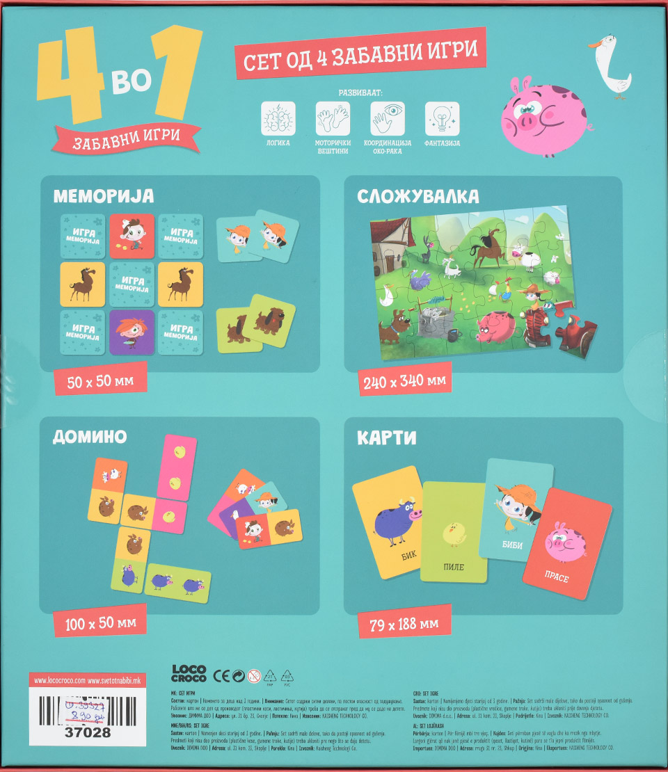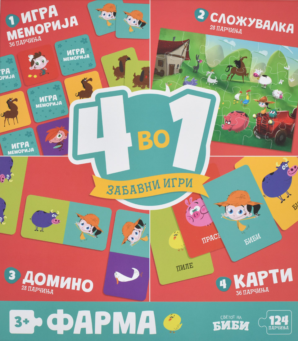 ФАРМА – друштвена игра со Биби и Боби е забавен и едукативен сет со четири игри во едно: Меморија, Домино, Карти и Сложувалка.