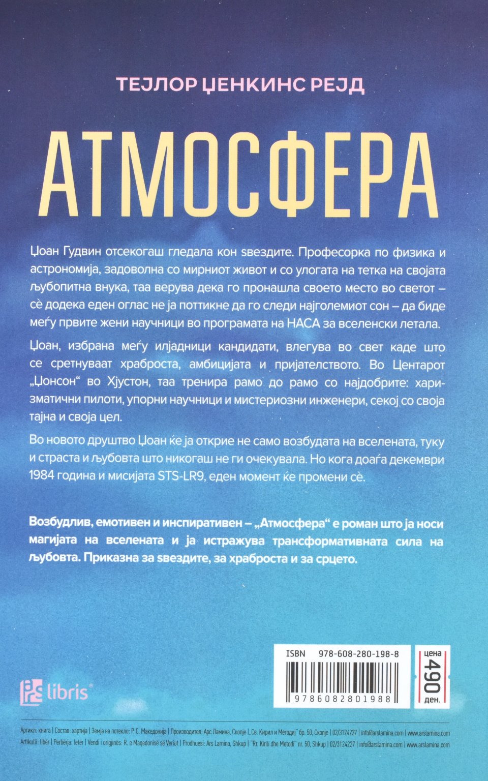 Возбудлив, емотивен и инспиративен – „Атмосфера“ е роман што ја носи магијата на вселената и ја истражува трансформативната сила на љубовта. Приказна за ѕвездите, за храброста и за срцето.