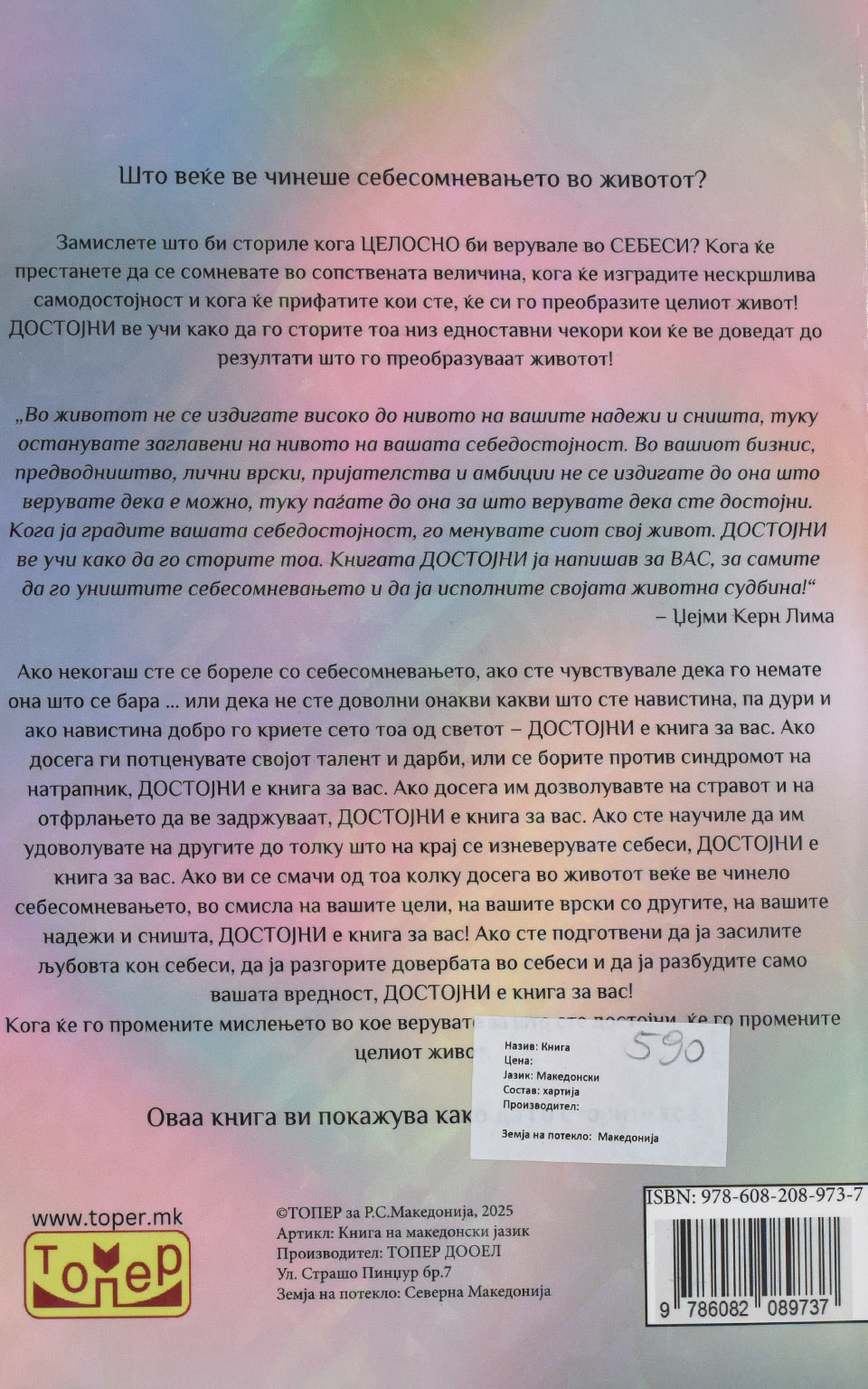 Замислете што би сториле кога ЦЕЛОСНО би верувале во СЕБЕСИ? Кога ќе престанете да се сомневате во сопствената величина, кога ќе изградите нескршлива самодостојност и кога ќе прифатите кои сте, ќе си го преобразите целиот живот! ДОСТОЈНИ ве учи како да го сторите тоа низ едноставни чекори кои ќе ве доведат до резултати што го преобразуваат животот!