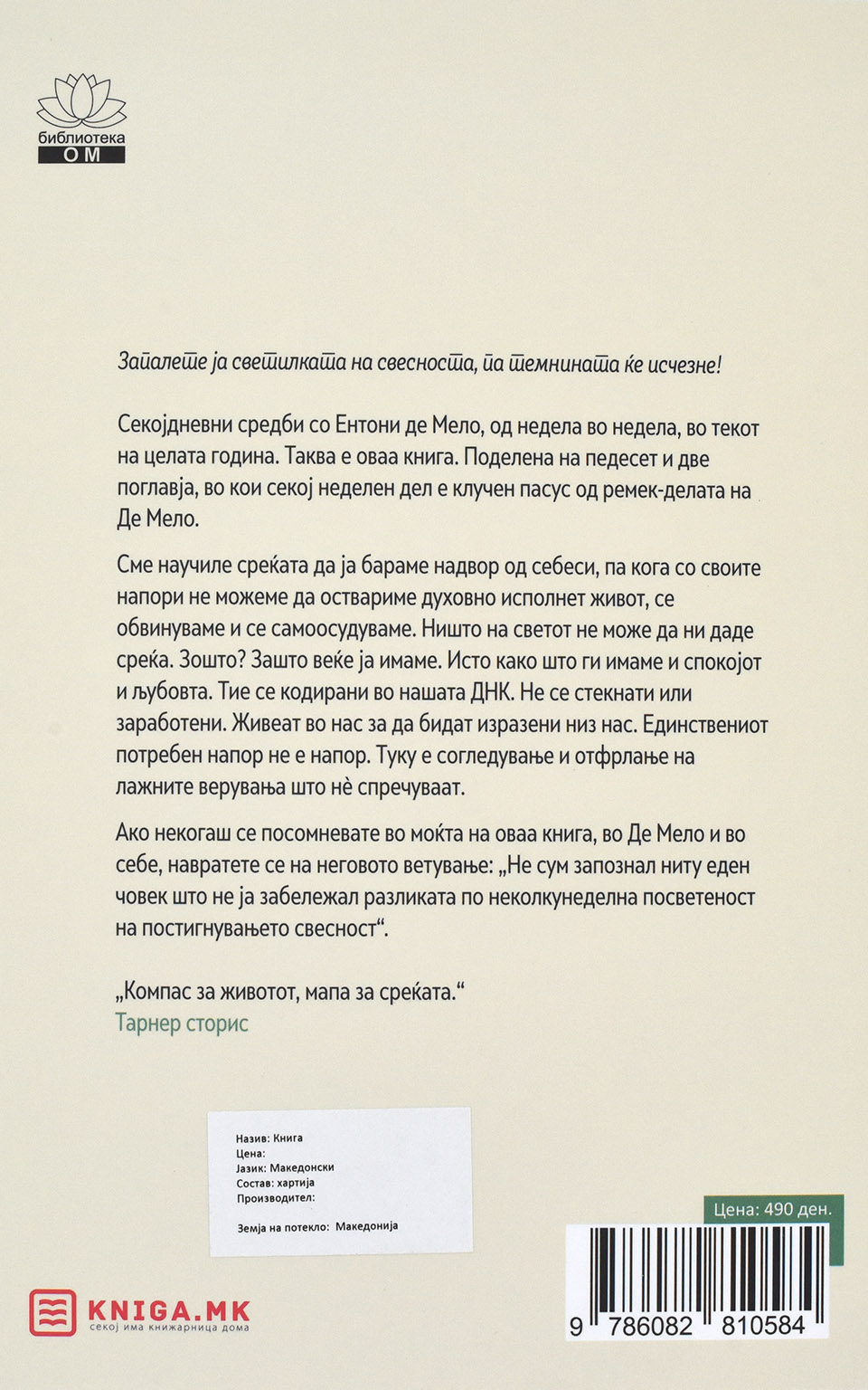 Секојдневни средби со Ентони де Мело, од недела во недела, во текот на целата година. Таква е оваа книга. Поделена на педесет и две поглавја, во кои секој неделен дел е клучен пасус од ремек-делата на Де Мело.