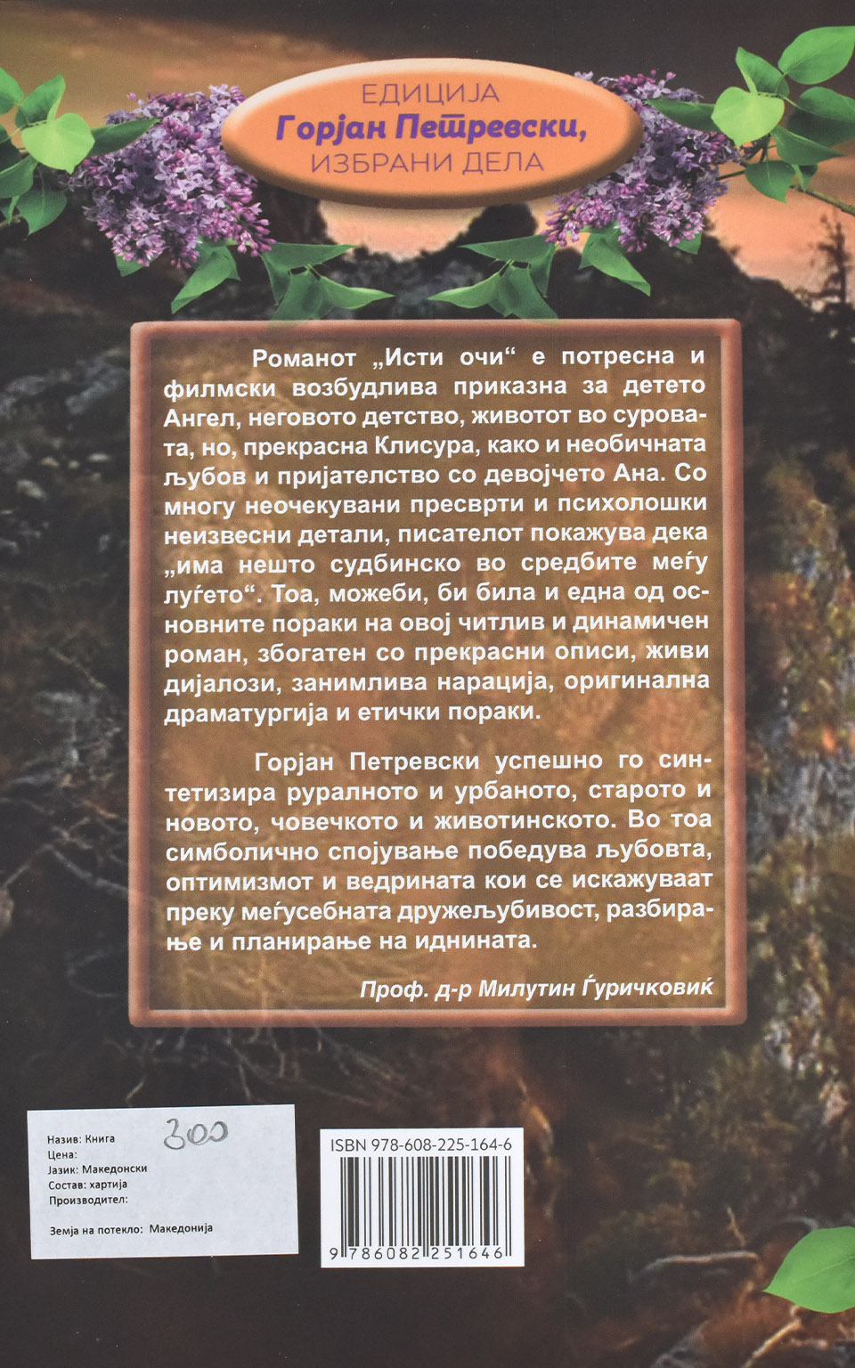 Романот „Исти очи“ од Горјан Петревски е потресна и возбудлива приказна која ги истражува темите на детството, љубовта и пријателството во суровата, но прекрасна Клисура. Главниот лик, детето Ангел, се соочува со предизвиците на животот, а неговата необична врска со девојчето Ана создава динамична и емоционална нарација. Петревски, познат по својот уникатен стил и способноста да создава живописни описи, нè воведува во светот на детските соништа и реалности, комбинирајќи психолошки длабочини со неочекувани пресврти.