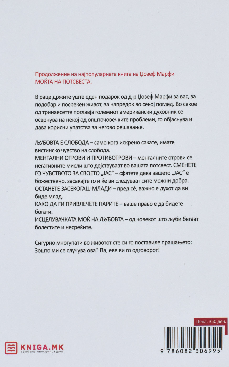 В раце држите уште еден подарок од д-р Џозеф Марфи за вас, за подобар и посреќен живот, за напредок во секој поглед. Во секое од тринаесетте поглавја големиот американски духовник се осврнува на некој од општочовечките проблеми, го објаснува и дава корисни упатства за негово решавање.