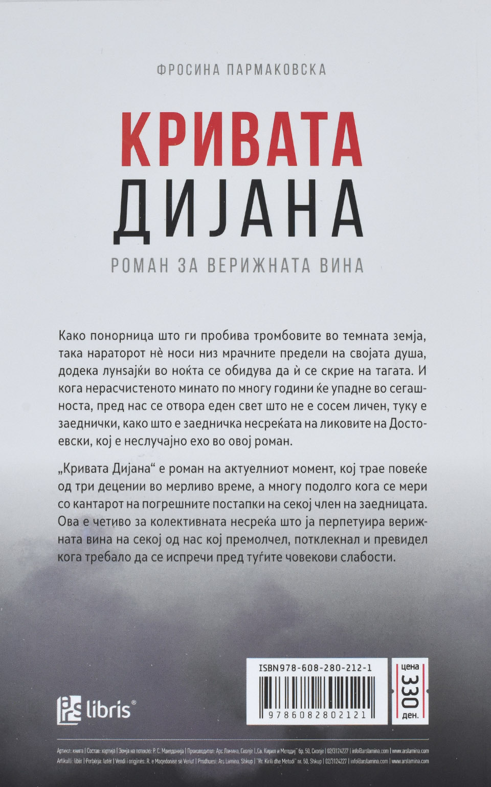 „Кривата Дијана“ е роман на актуелниот момент, кој трае повеќе од три децении во мерливо време, а многу подолго кога се мери со кантарот на погрешните постапки на секој член на заедницата. Ова е четиво за колективната несреќа што ја перпетуира верижната вина на секој од нас кој премолчел, потклекнал и превидел кога требало да се испречи пред туѓите човекови слабости.
