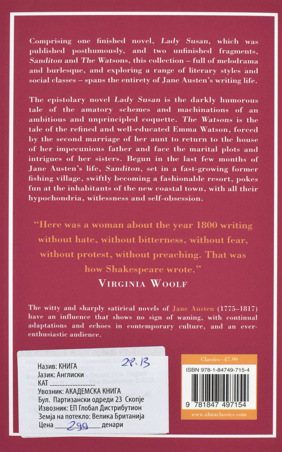 Comprising one finished novel, Lady Susan, which was published posthumously, and two unfinished fragments, Sanditon and The Watsons, this collection – full of melodrama and burlesque, and exploring a range of literary styles and social classes – spans the entirety of Jane Austen’s writing life.