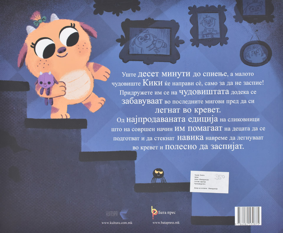 Уште десет минути до спиење, а малото чудовиште Кики ќе направи сè, само за да не заспие! Придружете им се на чудовиштата додека се забавуваат во последните мигови пред да си легнат во кревет. Од најпродаваната едукација на сликовници што на совршен начин им помагаат на децата да се подготват и да стекнат навика навреме да легнуваат во кревет и полесно да заспијат.