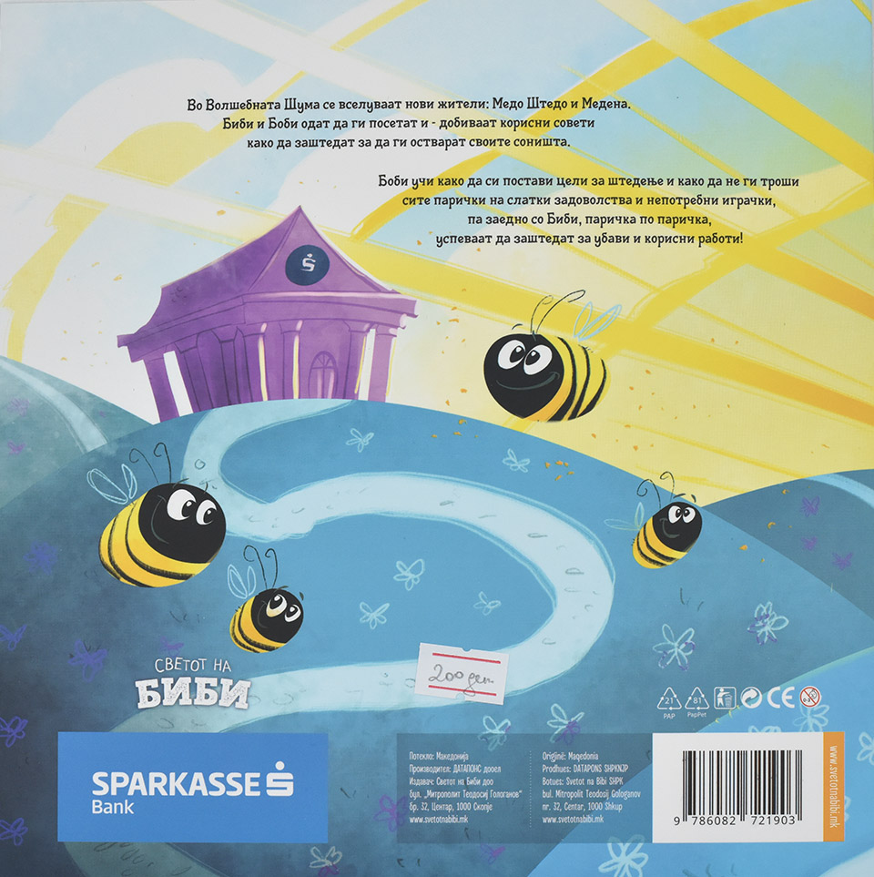 Боби учи како да си постави цели за штедење и како да не ги троши сите парички на слатки задоволства и непотребни играчки, па заедно со Биби, паричка по паричка, успеваат да заштедат за убави и корисни работи!