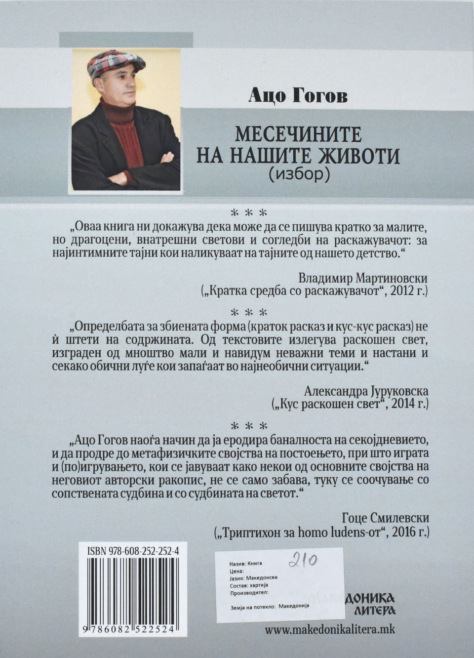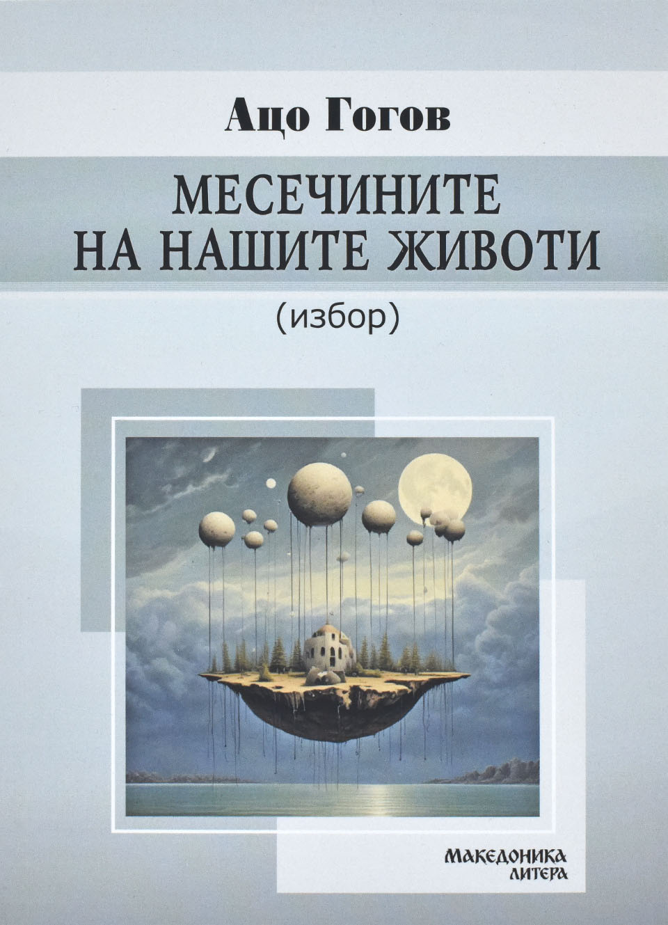 „Месечините на нашите животи“ од Ацо Гогов е емотивен роман кој низ интимна и поетична нарација ги истражува љубовта, времето и човечките односи. Преку приказни за секојдневието, спомените и промените што ги носи животот, авторот ги следи внатрешните борби и надежи на ликовите, прикажувајќи како различните „месечини“ – периоди на радост, загуба и созревање – го обликуваат човекот. Книгата нуди топол, меланхоличен поглед кон животот и потсетува на мааната и убавината на минливите моменти.