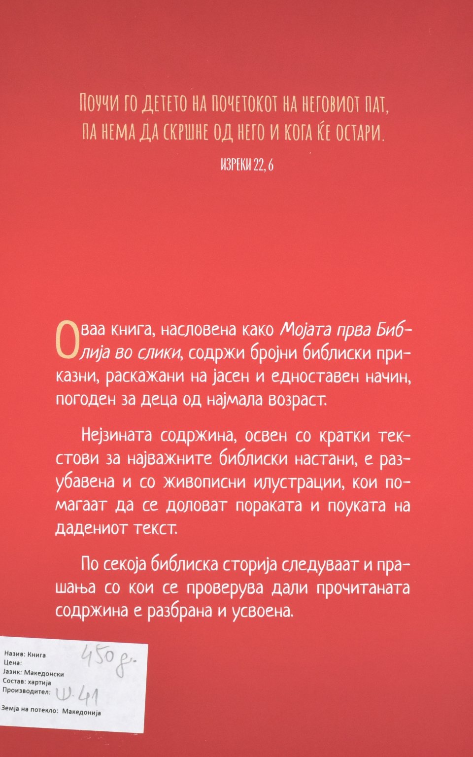 Оваа книга, насловена како Мојата прва Библија во слики, содржи бројни библиски приказни, раскажани на јасен и едноставен начин, погоден за деца од најмала возраст.