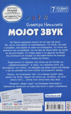 “Мојот звук” е возбудлива и емотивна книга од авторката Оливера Николова, позната по своите дела за младите читатели. Со уникатен стил и длабока психологија на ликовите, Николова успешно ја истражува сложеноста на односите помеѓу тинејџерите и нивните семејства, како и предизвиците со кои се соочуваат во процесот на созревање.