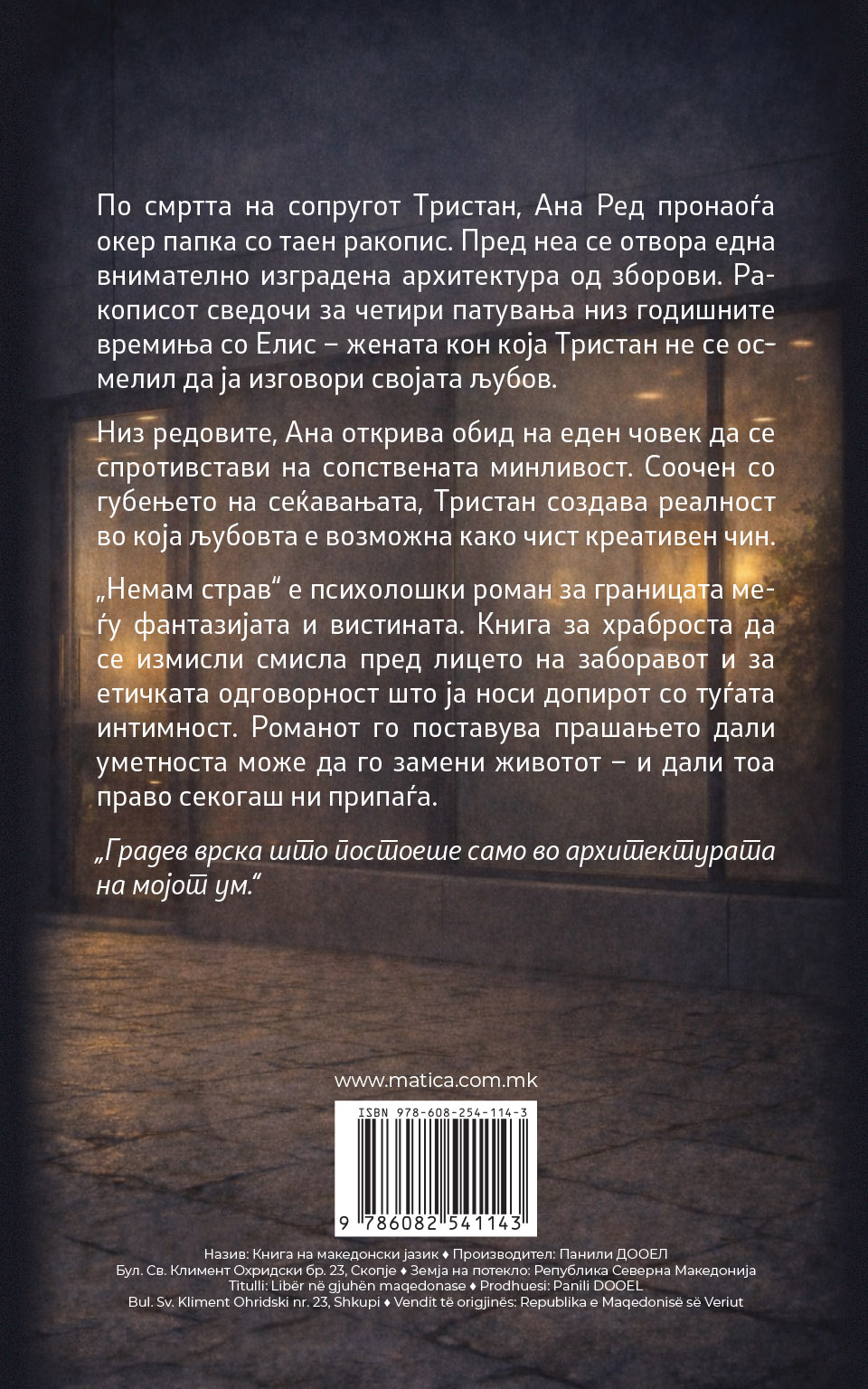 „Немам страв” е психолошки роман за границата меѓу фантазијата и вистината. Книга за храброста да се измисли смисла пред лицето на заборавот и за етичката одговорност што ја носи допирот со туѓата интимност. Романот го поставува прашањето дали уметноста може да го замени животот и дали тоа право секогаш ни припаѓа.
