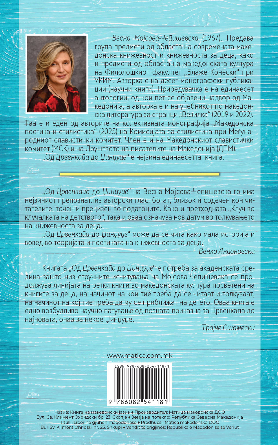 „Од Црвенкајa до Џинџуџе“ на Весна Мојсова-Чепишевска го има нејзиниот препознатлив авторски глас, богат, близок и срдечен кон читателите, точен и прецизен во податоците. Како и претходната „Клуч во клучката на детството“, така и оваа означува нов датум во толкувањето на книжевноста за деца. „Од Црвенкајa до Џинџуџе“ може да се чита како мала историја и вовед во теоријата и поетиката на книжевноста за деца. – Венко Андоновски
