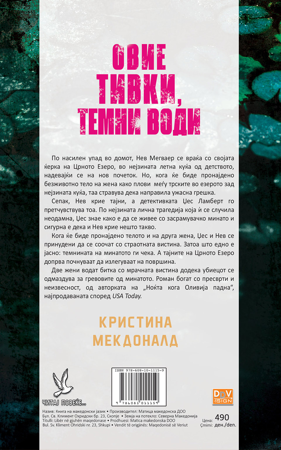 **Овие тивки, темни води** од Кристина Мекдоналд е напнат трилер кој истражува теми на тајни, загуба и мракот на минатото. По насилниот упад во нејзиниот дом, Нев Мегваер се враќа на Црното Езеро, надевајќи се на нов почеток со својата ќерка. Но, откритието на безживотно тело во езерото ја принудува да се соочи со своите најдлабоки стравови и тајни.