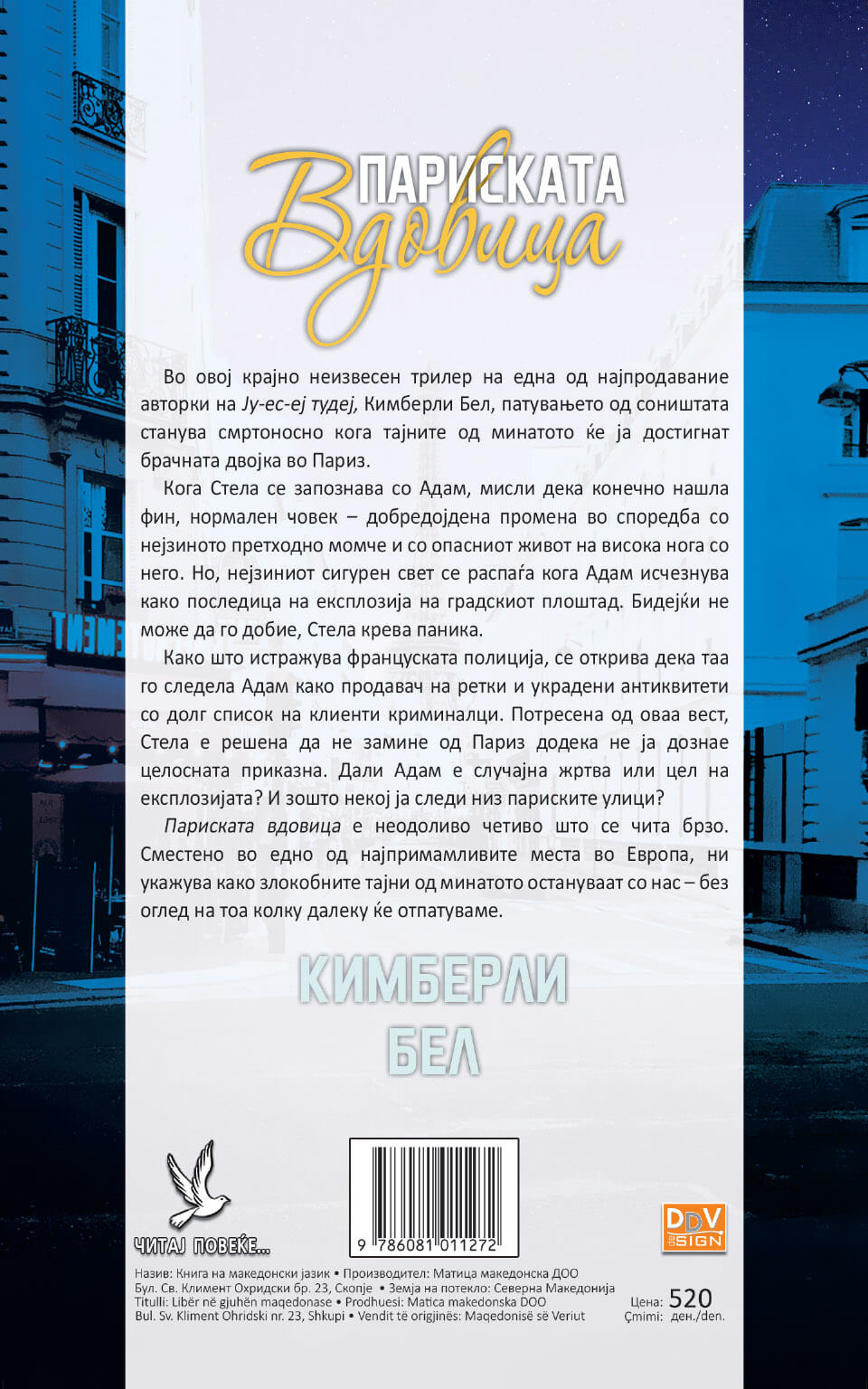 Во овој крајно неизвесен трилер на една од најпродаваните авторки на Ју-ес-еј тудеј, Кимберли Бел, патувањето од соништата станува смртоносно кога тајните од минатото ќе ја достигнат брачната двојка во Париз. Кога Стела се запознава со Адам, мисли дека конечно нашла фин, нормален човек – добредојдена промена во споредба со нејзиното претходно момче и со опасниот живот на висока нога со него. Но, нејзиниот сигурен свет се распаѓа кога Адам исчезнува како последица на експлозија на градскиот плоштад. Бидејќи не може да го добие, Стела крева паника. Како што истражува француската полиција, се открива дека таа го следела Адам како продавач на ретки и украдени антиквитети со долг список на клиенти криминалци. Потресена од оваа вест, Стела е решена да не замине од Париз додека не ја дознае целата приказна. Дали Адам е случајна жртва или цел на експлозијата? И зошто некој ја следи низ париските улици? Париската вдовица е неодоливо четиво што се чита брзо. Сместено во едно од најпримамливите места во Европа, ни укажува како злокобните тајни од минатото остануваат со нас – без оглед на тоа колку далеку ќе отпатуваме.