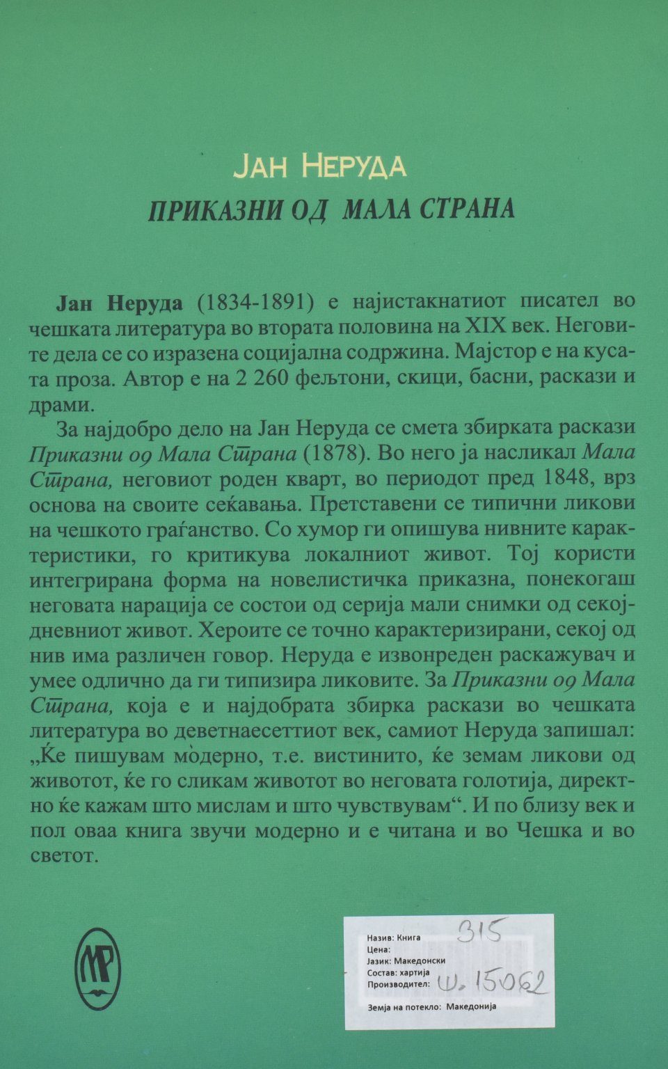 Јан Неруда (1834-1891) е најистакнатиот писател во чешката литература во втората половина на ХІХ век. Неговите дела се со изразена социјална содржина. Мајстор е на кусата проза. Автор е на 2 260 фељтони, скици, басни, раскази и драми.