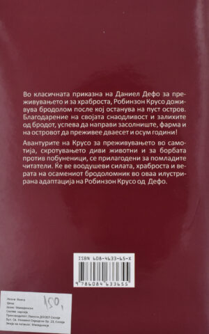 Во “Робинзон Крусо”, главниот лик доживува бродолом и се наоѓа на пуст остров, каде што со својата сналажливост и ресурси од бродот создава нов живот. Оваа приказна за изолација и борба за опстанок е не само возбудлива, туку и инспиративна, особено за помладите читатели. Книгата е илустрована, што ја прави достапна и привлечна за деца и тинејџери, но истовремено нуди и длабоки поуки за храброст и упорност.