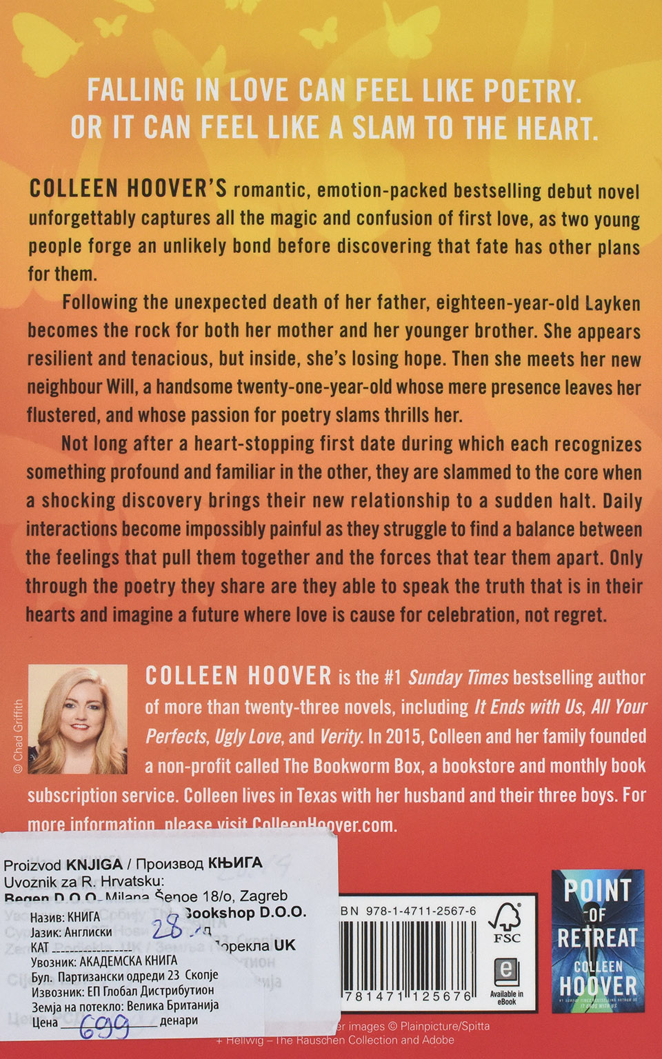 Colleen Hoover’s romantic, emotion-packed bestselling debut novel unforgettably captures all the magic and confusion of first love, as two young people forge an unlikely bond before discovering that fate has other plans for them.