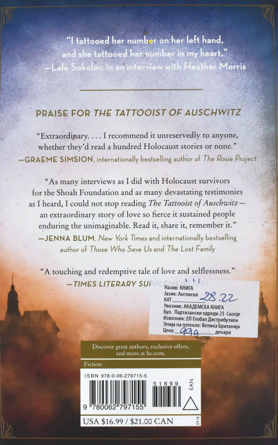 One day in July 1942, Lale, prisoner 32407, comforts a trembling young woman waiting in line to have the number 34902 tattooed onto her arm. Her name is Gita, and in that first encounter, Lale vows to somehow survive the camp and marry her.