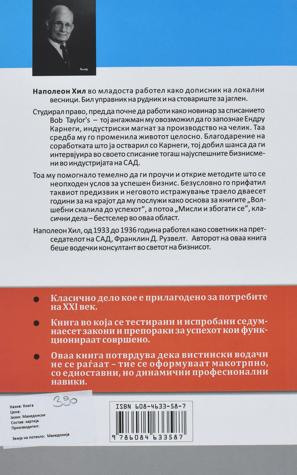 Наполеон Хил во младоста работел како дописник на локални весници. Бил управник на рудник и на стовариште за јаглен. Студирал право, пред да почне да работи како новинар за списанието Bob Taylor’s – тој ангажман му овозможил да го запознае Ендру Карнеги, индустриски магнат за производство на челик. Таа средба му го променила животот целосно. Благодарение на соработката што ја остварил со Карнеги, тој добил шанса да ги интервјуира во своето списание тогаш најуспешните бизнисмени во индустријата на САД. Тоа му помогнало темелно да ги проучи и открие методите што се неопходен услов за успешен бизнис. Безусловно го прифатил таквиот предизвик и неговото истражување траело дваесет години за на крајот да му послужи како основа за книгите „Волшебни скалила до успехот”, а потоа „Мисли и збогати се”, класични дела – бестселер во оваа област. Наполеон Хил, од 1933 до 1936 година работел како советник на претседателот на САД, Франклин Д. Рузвелт. Авторот на оваа книга беше водечки консултант во светот на бизнисот.