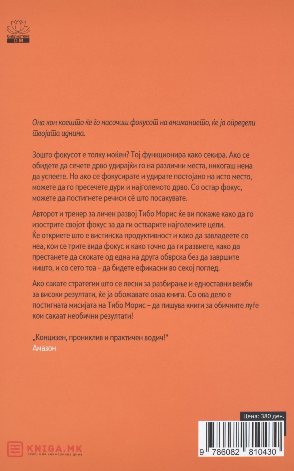 Авторот и тренер за личен развој Тибо Морис ќе ви покаже како да го изострите својот фокус за да ги остварите најголемите цели. Ќе откриете што е вистинска продуктивност и како да завладеете со неа, кои се трите вида фокус и како точно да ги развиете, како да престанете да скокате од една на друга обврска без да завршите ништо, и со сето тоа – да бидете ефикасни во секој поглед.