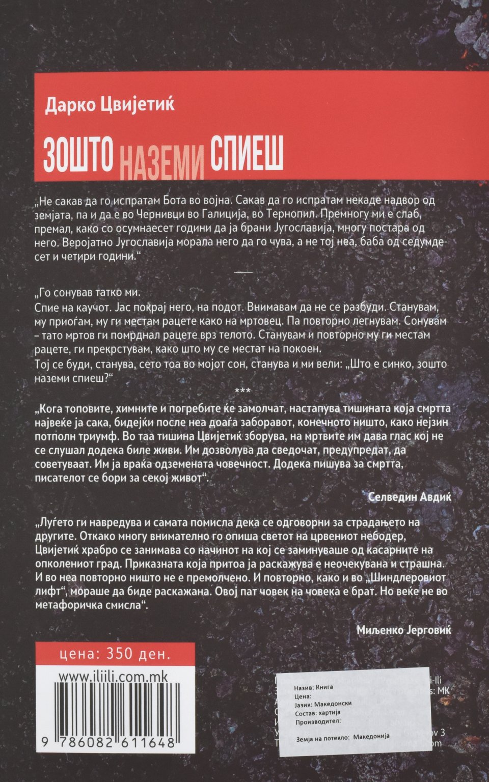 „Луѓето ги навредува и самата помисла дека се одговорни за страдањето на другите. Откако многу внимателно го опиша светот на црвениот небодер, Цвијетиќ храбро се занимава со начинот на кој се заминувашe од касарните на опколениот град. Приказната која притоа ја раскажува е неочекувана и страшна. И во неа повторно ништо не е премолчено. И повторно, како и во „Шиндлеровиот лифт“, мораше да биде раскажана. Овој пат човек на човека е брат. Но веќе не во метафоричка смисла“. – Миљенко Јерговиќ